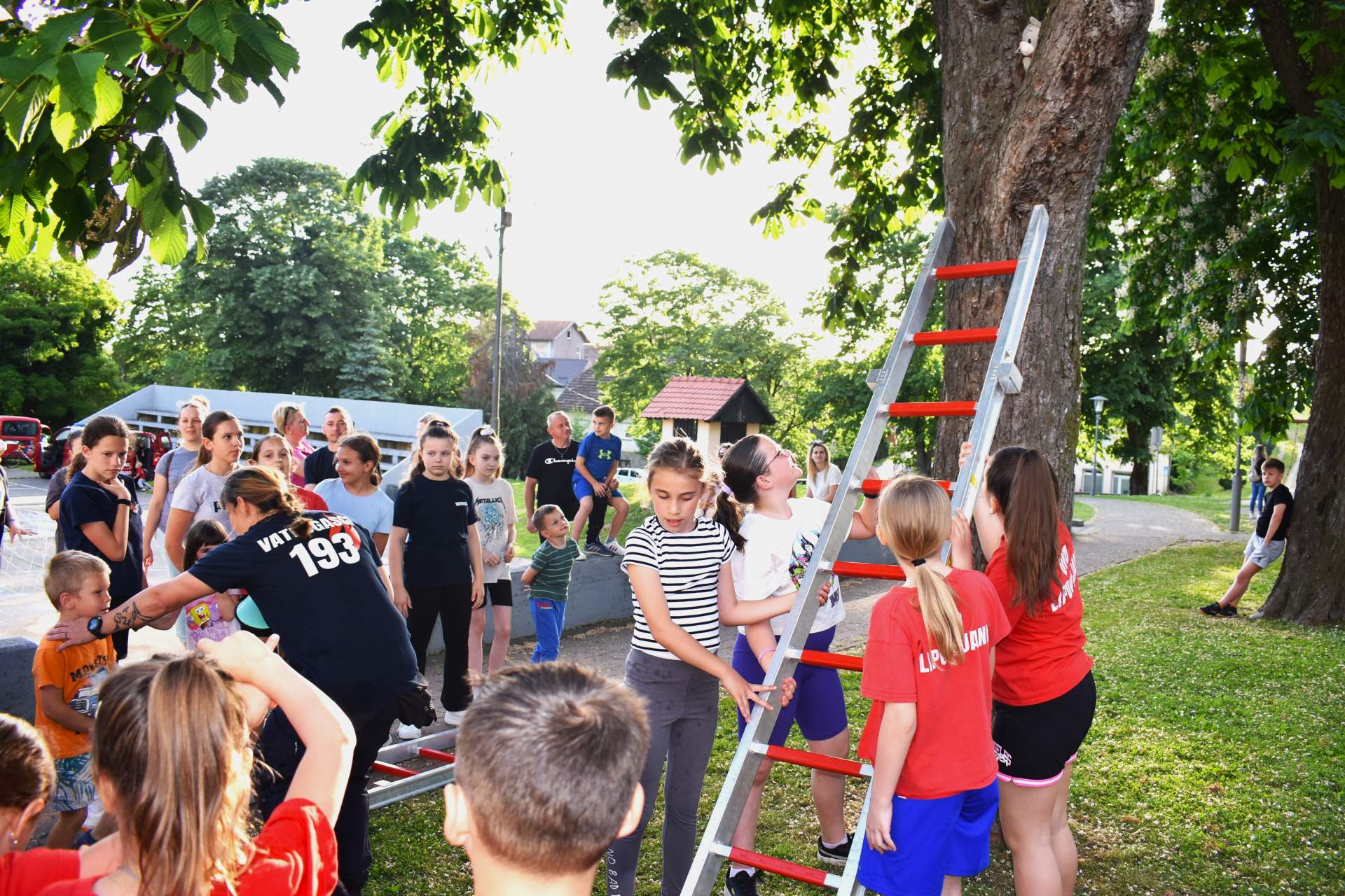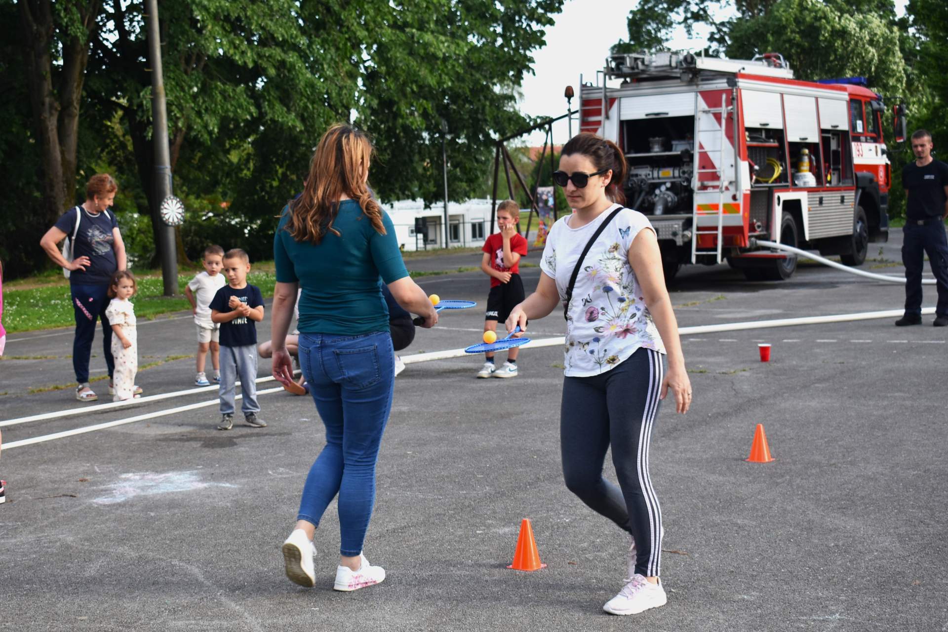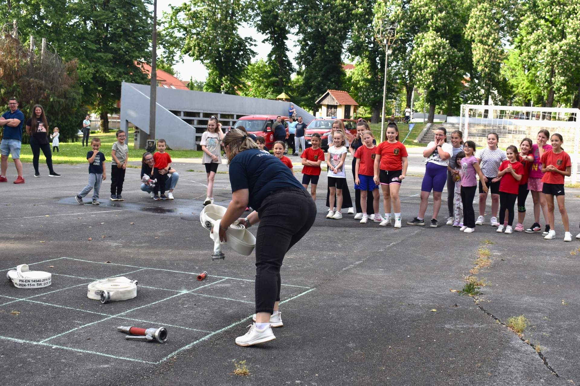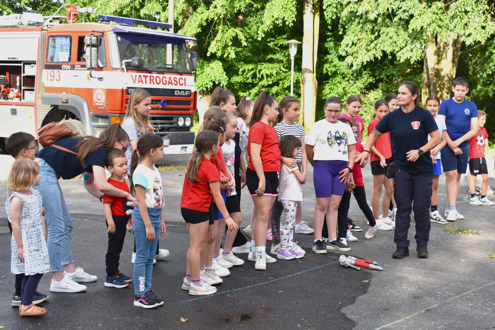 Tako je 70-tak najmlađih, uz svoje roditelje, zaigralo zanimljive i vesele igre. Bilo je tu slaganja križić-kružić kocke s vatrogasnom opremom, skupljanja bodova na ubacivanjima loptica, gađanje meta kroz mokru vatrogasnu vježbu, fotografiranje s vatrogascem, prenošenje loptica i traženje, odnosno spašavanje mačke u parku s drveća. Vesele igre trajale su više od dva sata, a onda su svi prisutni počašćeni grickalicama i sokom.